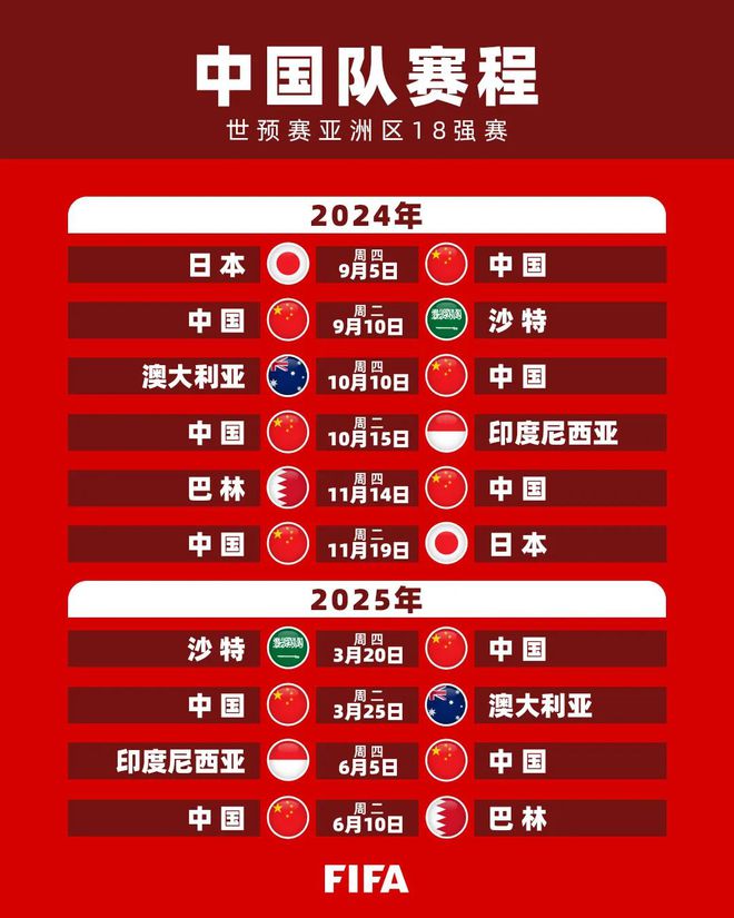根据国际足联公布的2026世界杯亚洲区预选赛18强赛程,中国男足在2025年将迎来四场关键战役:3月21日客场挑战沙特阿拉伯,3月25日主场迎战澳大利亚;6月5日主场对阵印度尼西亚,6月10日客场对决巴林。这四场比赛将直接决定国足能否保留晋级希望,其中3月双赛被视为出线形势的“分水岭”,而6月的主场收官战则是冲击附加赛资格的终极考验。